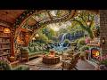 April Spring Jazz Ambience | Warm Waterfall Porch with Crackling Fireplace & Gentle Rain for Work