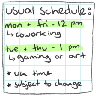 Mondays and Fridays: coworking at 12pm BST Tuesdays and Thursdays: art or games at 1pm BST