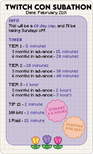 You may come across my emotes on twitch as I do commissions for other twitch streamers. This I typically will do on stream as well so you'll be able to get a little BTS of the process! I typically stream in the evenings AEST 6/7:00pm~