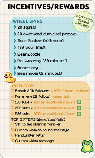 The Bee Movie (5 mins), VIP for a month, No Swearing (20 mins), Sour Sucker, TnT Blast, choose my discord PFP for 24 hours, bunny ears, cat, 20 Squats, Timeout Viewer