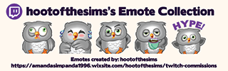 My name is Amanda (also known as hoot.) One of my passions has always been playing the Sims! I started playing the Sims ever since "The Sims" came out (I have played The Sims, Sims 2, Sims 3 and currently Sims 4.) I love painting, playing the Sims, Minecraft, Call Of Duty WWII, Harry Potter, The Hunger Games, Rocky movies, Avatar (James Cameron) and so much more! I love building in the Sims 4, but I mostly do challenges on stream. I also stream Minecraft and Call Of Duty WWII. My streams are not "family friendly" but are not raunchy. Positive vibes are welcome! The Parliament welcome's and accept everyone for who they are! So, hit that follow button to become a "little owl!"