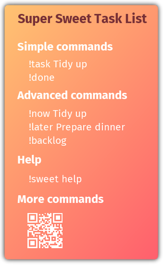 !task [your task here] - adds a task to the bar !remove - gets rid of your task !rename - rename your existing task !done - marks your task as done! !backlog - see what tasks are in your to-do list !now - replace your tasklist on the screen with what you're currently doing !later - add something to your backlog !now # - put a task from your backlog on the screen !randomtask - creates a tiny, positive task :) !sweet: help