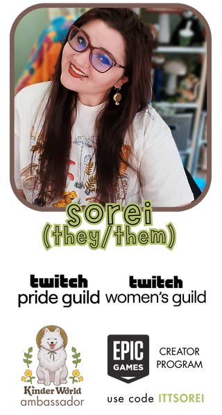 welcome! my name is sorei (they/them) which rhymes with "hurray!" i'm a 30-something queer femme content creator living in nyc. the theme of my streams is distraction; we appreciate the scenic route as permanent sidequesters and hope you join us in smelling the flowers! i believe deeply in communal thriving & helping to facilitate a space in which we can do so together. i currently play a lot of cozy indie games & reload fornite, with the occasional co-op horror.