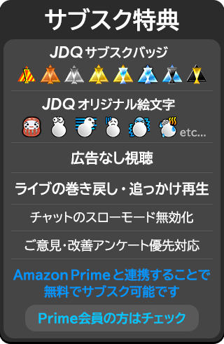 ・JDQ-TwitchではYouTubeの試験放送(ch.2)の映像を配信しております。最新のデザインや開発を反映しておりますので、些細なバグや誤動作等の可能性がある事に留意してご覧ください。