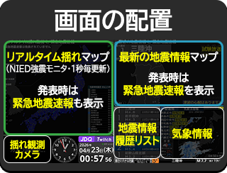 ・タイトル等の「最速」とは気象庁が発表してから平均0.1秒未満の僅かな遅延で放送用PCの配信画面・音声に情報が反映されるという意味を指しています。