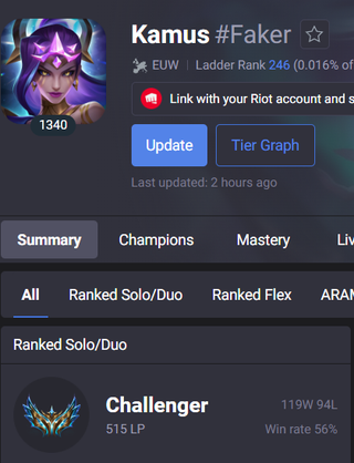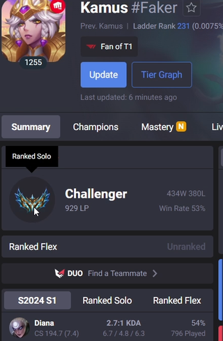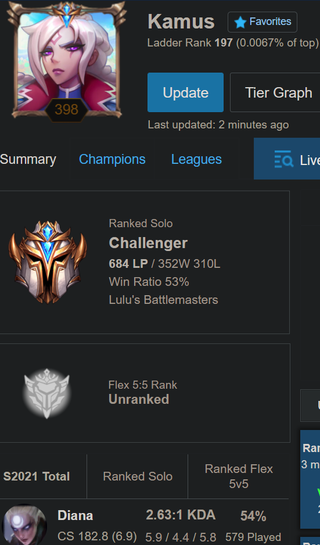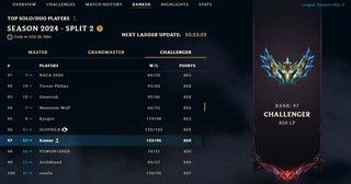 Season 2 - 990elo aka wood 5 Season 3 - Diamond 1 Season 4 - Diamond 1 Season 5 - Didn't play at all Season 6 - Didn't play at all Season 7 - Didn't play at all Season 8 - Cameback (D4) Season 9 - Masters 173 lp peak Season 10- Masters 195 lp peak Season 11- CHALLENGER 785 lp Peak Season 12- GrandMaster 794 lp Peak Season 13- GrandMaster 998 lp Peak Season 14- CHALLENGER 929 lp Peak Season 14.2- CHALLENGER 950 lp (Rank 100) Season 14.3- Challenger 525LP