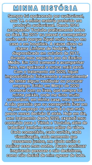 Olá, meu nome é Matheus Marcondes. Tenho 24 anos. Sou de Taubaté-SP (a cidade da grávida e do Parkour). Sou apaixonado por futebol, informática e doguinhos (bem eclético né? kkkkkk) Nas lives, a gente faz campeonatos de futebol envolvendo o chat! E, recentemente, começamos a jogar bastante Pokémon e já zeramos The Last Of Us e Detroit!