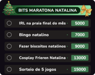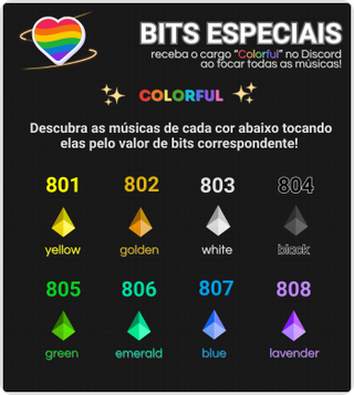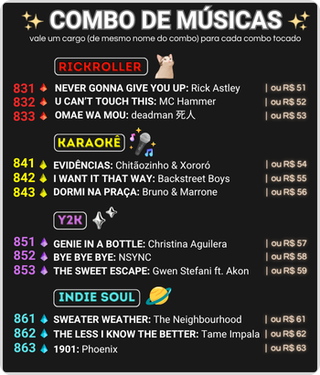 9 bits - Gemido anime 11 bits - Creeper 17 bits - Tururu sad 18 bits - Crab rave 21 bits - Tururu funk 22 bits - Mistério 26 bits - John Cena 51 bits - Flauta desafinada Harry Potter 52 bits - Flauta desafinada Titanic 76 bits - Ó o gás 91 bits - Dicks 99 bits (ou R$ 6,66) - É a ambulância besta 101 bits - Tiro 149 bits - Geladeira tsunami 199 bits (ou R$ 14,14) - Rojão estourado 222 bits (ou R$ 19,99) - Call do discord estourada 249 bits - Sente a pressão neném 269 bits - Saxofone (Careless Whisper) 333 bits (ou R$ 22,22) - Vuvuzela estourada 444 bits (ou R$ 33,33) - Gemidão 666 bits (ou R$ 44,44) - Grito exorcista 999 bits (ou R$ 66,66) - Funk estourado 10000 bits (ou R$ 600) - Billionaire - Travie McCoy ft. Bruno Mars 20000 bits (ou R$ 900) - Thrift Shop - Macklemore & Ryan Lewis (feat. Wanz) 30000 bits (ou R$ 1700) - Glamorous - Fergie