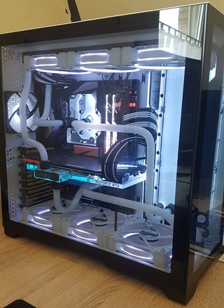 Das ganze mit einer Customwasserkühlung versehen an 2 360er Radiatoren, die Cpu mit Monoblock und Chipsatz wassergekühlt.