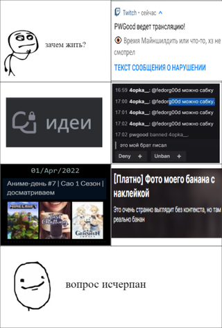 Вопрос: Как ты относишься к аниме? Ответ: Никак. Большая часть из того, что я видел, проходит мимо меня, мягко говоря. В большинстве, аниме очень клишированное, кринжовое местами и рисовка сосёт часто. Но я не хейтер ибо и тут есть исключения. Короче, не предлагайте мне свои аниме блин, если я захочу посмотреть и захочу вашего анимешного совета, я спрошу. А, и лучше держать свои кринжовые аниме мемы подальше отсюда, модеры не спят. Никогда...