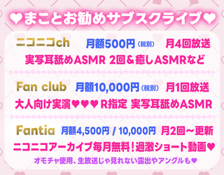 [ニコニコch]→月4回ASMR生放送 実写耳舐め。 [Fan club]→月1回ニコニコより過激実写耳舐め。 [Fantia]→ショート動画や写真。