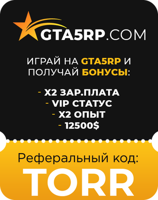 КЛИКНИ НА БАННЕР! Начни играть со мной на GTA5RP вводи мой промо TORR на любом из серверов и получишь плюшки! НАЖМИ В ИГРЕ Ф10- ШЕСТЕРЁНКА(НАСТРОЙКИ)-ПРИГЛАШЕНИЕ И ВВОДИ БОЛЬШИМИ БУКВАМИ TORR