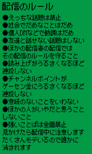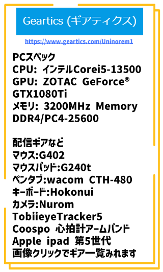 2021/6/6 配信開始 2021/7/11 Follower100人達成 2021/7/20 ファスモ大会出場 2021/8/19 アフィリエイト条件達成 2021/8/24 Follower200人達成 2021/9/26 全シーズンのキルレを1.0にする耐久にて300人 Follower達成 2021/11/11 Folllower400人 達成 2021/11/14 e-triathlon参加 さこに負ける 2021/12/10 Follower500人 達成 2022/1/2 Follower600人 達成 2022/1 ロボトミークリア耐久 2022/2/2 Follower700人 達成 2022/3/2 Follower 800人 達成 2022/5/7 Follower 900人 達成 2022/5/8 E-triathron参加 さこに負ける 2022/7/1 Follower 1000人 達成 2022/8/23 Follower 1100人 達成 2022/10 Noita1ヶ月生活 2022/10/10 Follower 1200人 達成 2022/11/14 Follower 1300人 達成 2022/12 龍が如くシリーズ踏破 2022/12/14 Follower 1400人 達成 2023/1/17 Follower 1500人 達成 2023/2/16 Follower 1600人 達成 2023/4/8 Follower 1700人 達成 2023/4 バイオハザードシリーズ踏破 2023/6/4 Follower 1800人 達成 2023/8/13 Follower 1900人 達成 2023/10/2 Follower 2000人 達成 2023/11/2 総配信時間10000h 達成 2023/12/18 Follower 2100人 達成 2024/3/18 Follower 2200人 達成 2024/4/28 Follower 2300人 達成 2024/5/30 Follower 2400人 達成 2024/7/29 Follower 2500人 達成 2024/10/8 Follower 2600人 達成 2024/12/14 Follower 2700人 達成 2025/3/5 総配信時間 15000h 達成! 2025/3/11 Follower 2800人 達成 2025/5/24 Follower 2900人 達成 2025/8/10 出会いを求めて東京へ RiJボランティア参加